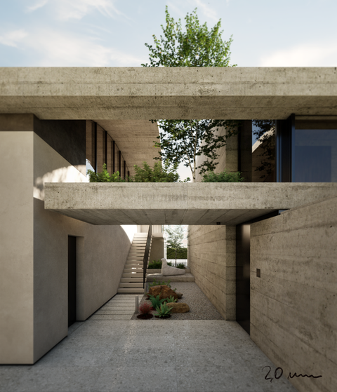 The building is composed of two volumes, separated by a private patio: the first, close to the rear buildings, serves as a filter, housing the garage and service rooms; the second, facing the continuous flow of life, is the living space.