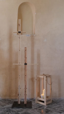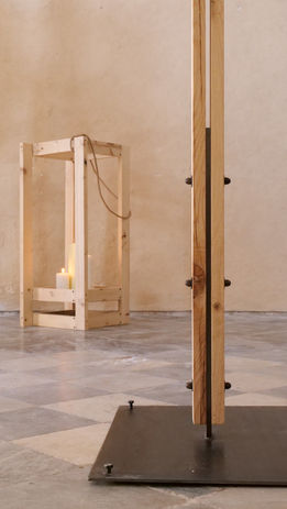 Simple lanterns and long trestles made of recycled fir and chestnut frame a wedding celebration in the former Santa Maria in Selàa Oratory, in the heart of the picturesque village of Tellaro. The double cross of the trestles evokes the distant religious past of the place. However, as soon as the two horizontal wooden slats are adjusted to hold the works of Welsh artist Susie Barrow, that symbolic image dissolves, making way for a simple material dedicated to art.